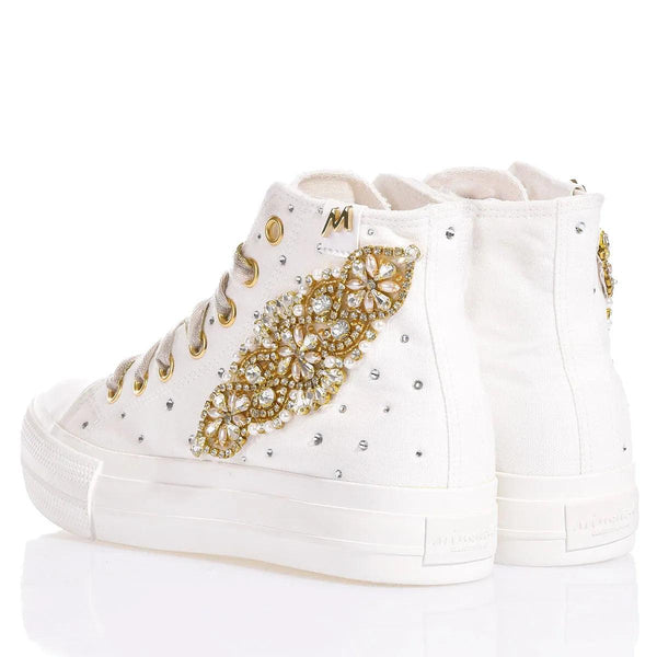 Queste sneakers, ispirate al classico modello Converse, vantano una suola platform completamente bianca che slancia la figura senza compromettere il comfort. A renderle uniche è l'applicazione laterale di mini castoni Swarovski e perle incastonate nelle tonalità oro, arricchite da una cascata scintillante di cristalli Swarovski lungo il lato. ui