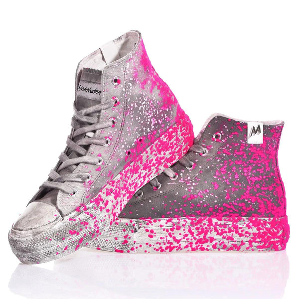 Interamente delavate in grigio, queste sneakers si distinguono per la floccatura fucsia fluo che cattura immediatamente l'attenzione. Il contrasto tra il grigio morbido e il fucsia brillante dona un look audace e moderno, perfetto per chi ama farsi notare.
