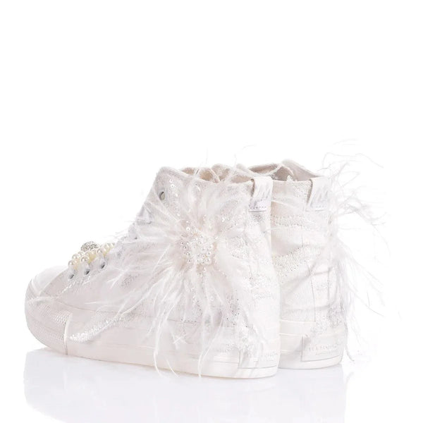 Occhielli bianchi e lacci delicati in raso bianco con perle e sfera in swarovski completano l’estetica lussuosa, facendo delle Mimanera Airlines Platform Gabrielle l’accessorio ideale per chi desidera un look unico e sofisticato. Indossa queste sneakers per lasciare il segno e catturare tutti gli sguardi.