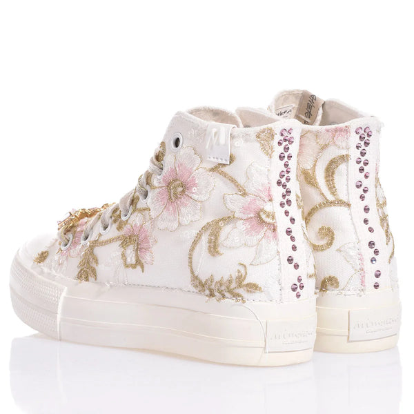 Gli occhielli bianchi e i lacci in organza beige, champagne e oro sono resi ancora più preziosi dall’accessorio con pietre incastonate sul fondo dell’allacciatura abbinati perfettamente alla scia di swarovski sul retro, conferendo un ulteriore tocco di eleganza e rendendo queste sneakers perfette per chi desidera rivivere l'atmosfera della corte francese con un twist moderno.