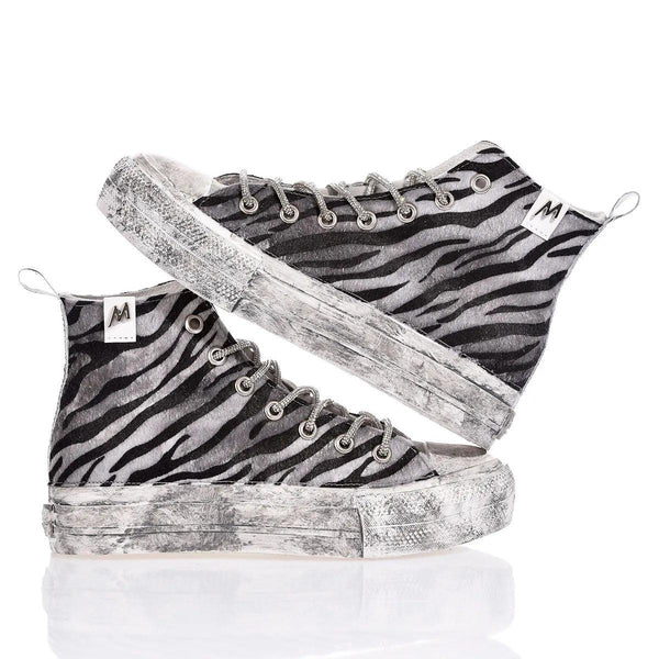 Il lato esterno è caratterizzato da una fantasia zebrata delavata, mentre il lato interno è in ecopelle pitonata argentata ed il retro in tessuto argentato, donando così un contrasto elegante. Suola e linguetta delavate amplificano l’effetto street. I lacci in Swarovski aggiungono una scintillante nota di lusso, completando il look. Perfette per chi cerca una sneaker che faccia parlare di sé, ma che rimanga comoda e versatile.