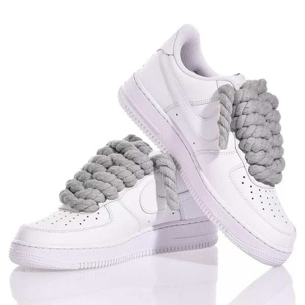 Nike Air Force 1 Boom Laces Grey è la sneakers custom must have di questa stagione! L'iconico modello Air Force rivisitato con etichetta esterna sotto lo swoosh e maxi lacci in corda grigi per un gioco di volumi mai visto prima!