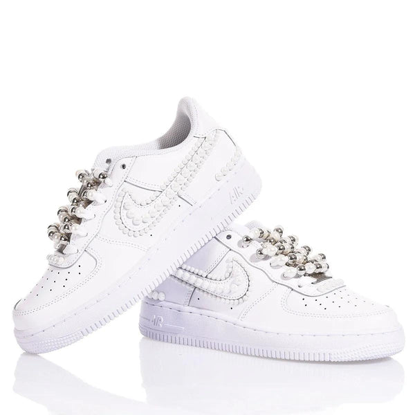 Nike Air Force 1 Pearly è la sneakers che trasforma il classico in un’opera d’arte raffinata! Totalmente bianca, questa scarpa si distingue per i dettagli eleganti che la rendono unica: lo swoosh, evidenziato interamente da perle, cattura subito l’attenzione con il suo effetto luminoso e delicato. I lacci, impreziositi da sfere in nickel e perle, aggiungono un tocco di lusso discreto e sofisticato, perfetto per chi ama un design esclusivo. Un modello che unisce la tradizione della Air Force 1 con un accento di eleganza senza tempo, ideale per la donna che non ha paura di brillare, ma con classe.