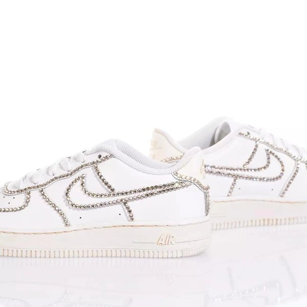 Nike Air Force Vanity Sand è la sneakers custom super preziosa da donna. I profili in Swarovski accarezzano i tratti iconici e distintivi di questa sneakers resa ancora più particolare dalla suola color sabbia.