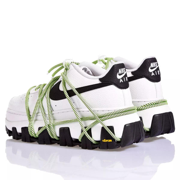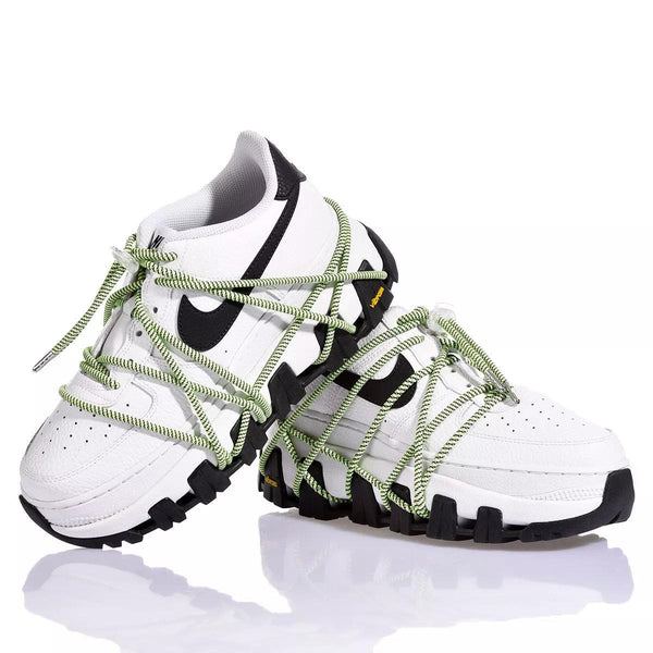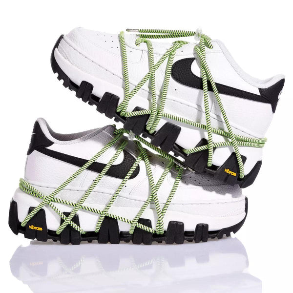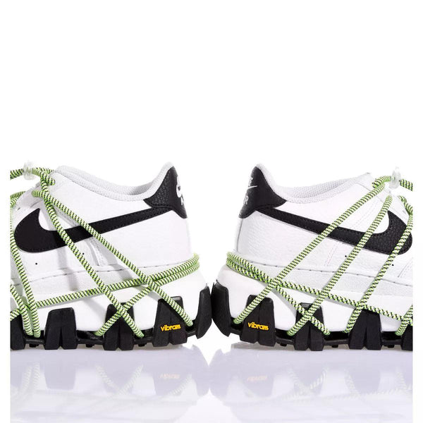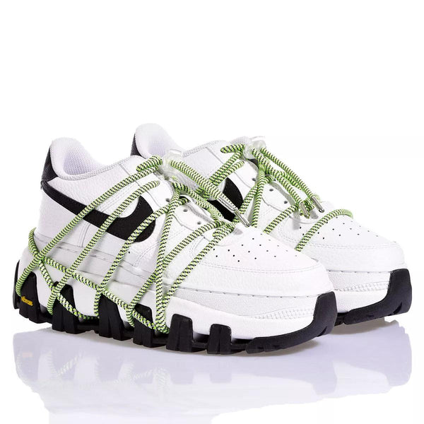 Nike air force 1 Vibram Pack è la sneakers custom che non ti aspettavi! L’iconico modello della Nike incontra la tecnologia delle suole Vibram grazie all’interpretazione Mimanera: gioco di intrecci con laccio elastico dalle tonalità fluo ricopre interamente la tomaia passando per la suola. Grazie allo stopper trasparente sarà semplicissimo regolare l’intreccio, creare il tuo intreccio o cambiare laccio. Potrai rendere unico il tuo paio di Nike AIR FORCE 1 Vibram Pack ogni volta che vorrai!