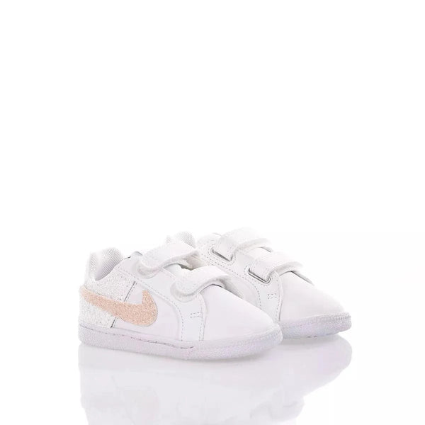 Nike Baby Amelie la sneakers per i più piccoli dal tono pastello. La parte posteriore viene ricoperta dal classico glitter bianco mentre sullo ''swoosh'' è stato cucito un particolare glitter più delicato dal colore pastello permetterlo in risalto ma con un tocco di eleganza adatta all'occasione. Nike Junior Amelie presenta un laccio di raso panna oltre che al suo originale bianco.