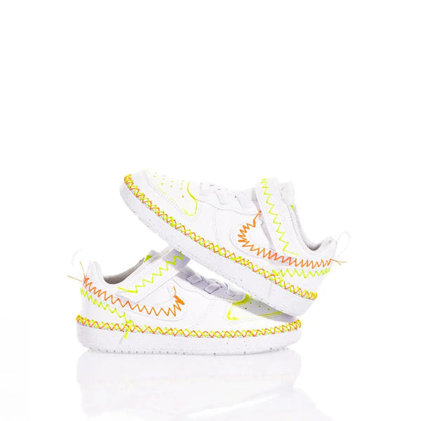 Nike Baby Wax è la sneakers custom per i più piccoli dal design unico, che cattura l'attenzione grazie allo zig zag bicolor, giallo e arancione fluo che aggiunge un tocco di energia e originalità, grazie anche alla leggera delavatura in giallo fluo sulla punta.
