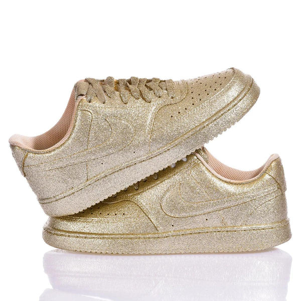 Nike Full Gold è la sneakers che trasforma ogni passo in una scintillante dichiarazione di stile! Interamente ricoperta di glitter color oro, questa scarpa cattura immediatamente l'attenzione, regalando un effetto luminoso e sofisticato. Il design minimalista, unito alla brillantezza dorata, fa di questa Nike un vero e proprio pezzo di lusso, perfetto per chi vuole unire comfort e glamour in un unico look.