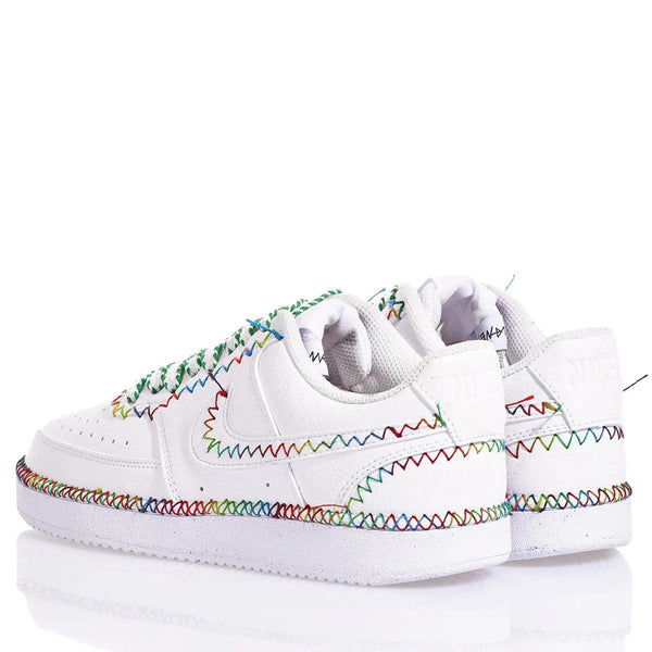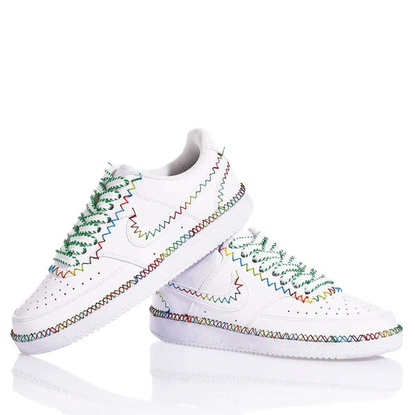 Nike Wax è la sneakers custom dal design unico, che cattura l'attenzione grazie allo zig zag multicolor che aggiunge un tocco di energia e originalità. I lacci in cotone bianco, arricchiti da impunture a vista color verde, aggiungono un ulteriore dettaglio, sottolineando la cura artigianale.