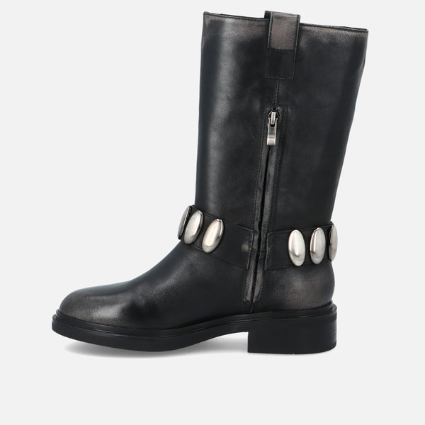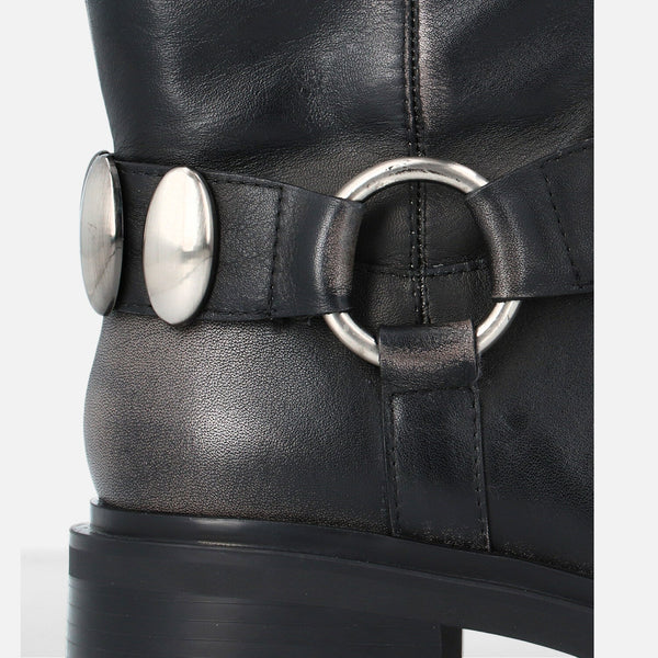 Ol Alia sono biker in pelle dai toni vintage e dal carattere deciso e contemporaneo. La tomaia liscia si sviluppa in un design lineare e compatto, impreziosita da una fascia decorativa con maxi borchie ovali e anello centrale metallico che richiama lo stile biker. Il gambale medio e il tacco basso lo rendono pratico e confortevole per l’uso quotidiano, mentre la finitura ottenuta grazie a una decapatura della pelle, aggiunge un tocco old wild west. Ideale da abbinare a look urban e capispalla in pelle o lana per un outfit grintoso ma curato nei dettagli.