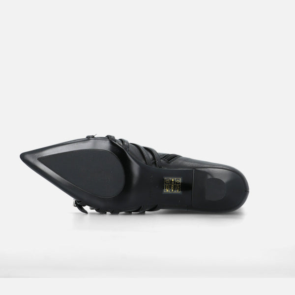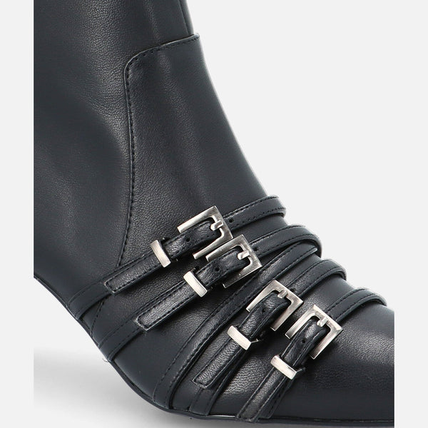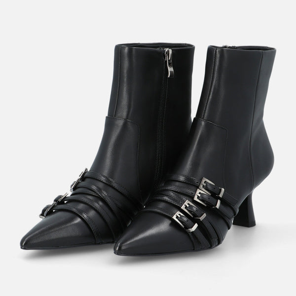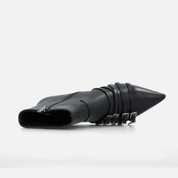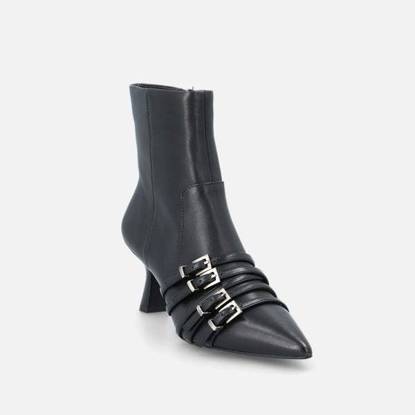 Questo tronchetto Oli Asur in pelle nappa è un modello di forte impatto visivo, che fonde eleganza rétro e dettagli rock. La linea affusolata con punta allungata slancia la figura, mentre la tomaia cattura la luce con una brillantezza decisa. Il design è arricchito da sottili cinturini con fibbie metalliche silver, che avvolgono il piede donando ritmo e carattere. Il tacco a rocchetto di media altezza, dalla forma svasata, aggiunge un tocco sofisticato senza rinunciare alla stabilità. Una calzatura ideale per chi cerca uno stile audace ma raffinato, perfetta per elevare con personalità qualsiasi outfit.