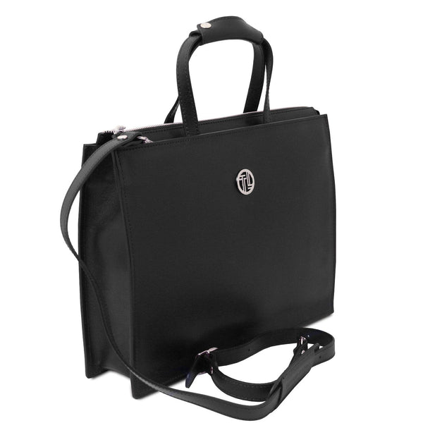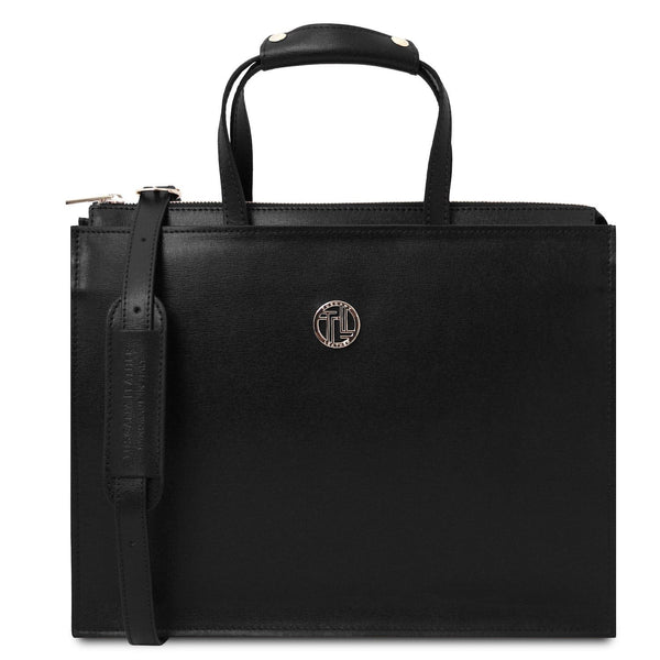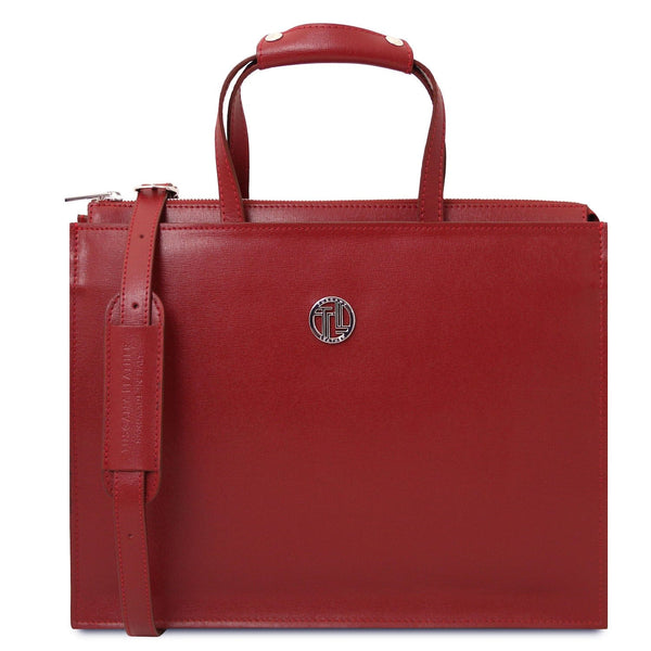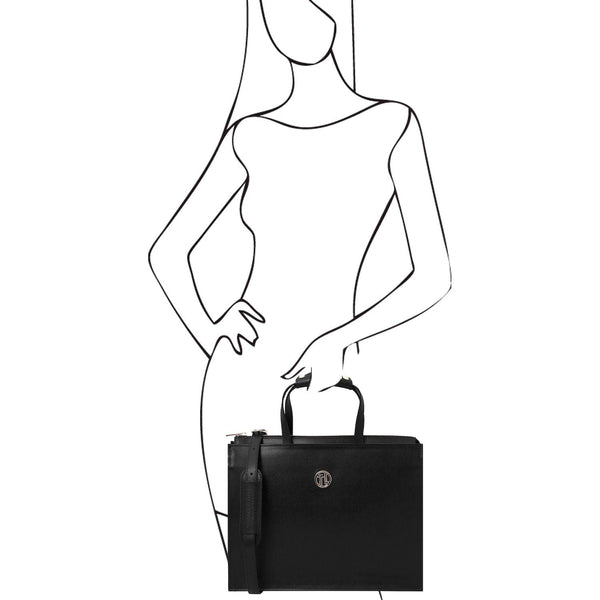 This sophisticated 3-compartment saffiano leather briefcase is perfect for the modern woman. Crafted from premium Saffiano leather, it features a sturdy structure that allows you to neatly organize your essentials. The interior includes a keyring attachment, credit card pockets, and secure zipped pockets, ensuring that everything has its place.