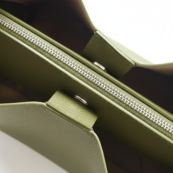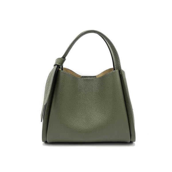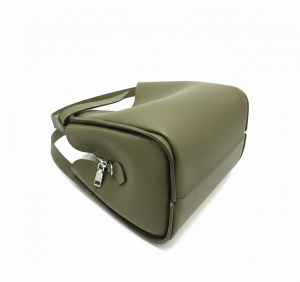 The Pienza Tote Handbag in olive green brings a refined pop of colour to your everyday style. Handcrafted in Italy from soft pebbled leather, it combines elegance with practicality. With three compartments, including a central zipped section with an additional interior zipped pocket, it keeps your essentials secure and organised while maintaining a sleek silhouette. The silver-toned hardware and detachable leather strap allow versatile styling. Carry it by hand, over the shoulder, or as a crossbody.