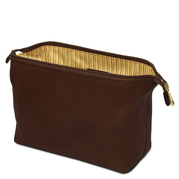 Travel in elegance with this large, practical leather toiletry bag made of full-grain, vegetable tanned leather in a chic matte finish. Featuring top-notch craftsmanship, our Italian-made smarty bags offer both men and women a stylish way to stay organized on the go. Handmade by skilled artisans, each piece is crafted from the highest quality Italian leather, showcasing the beauty of traditional Tuscan leather goods.