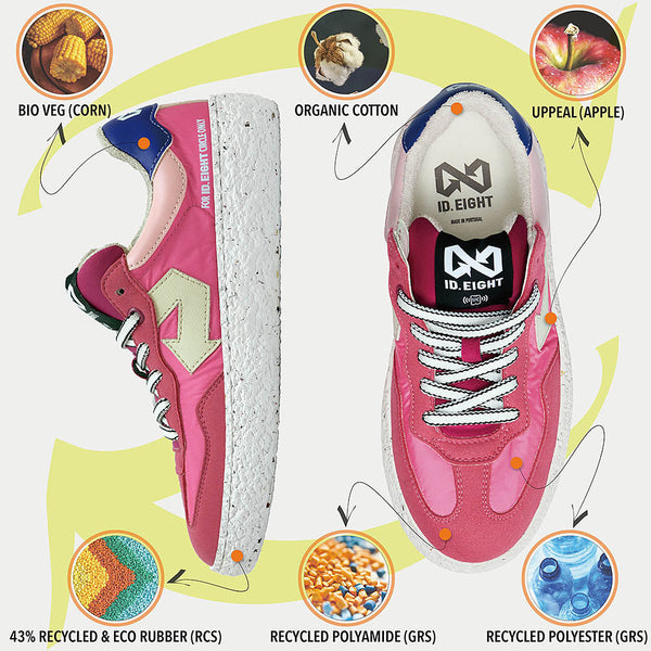 Realizzata con materiali sostenibili come BioVeg (a base di mais), Uppeal (ottenuto dagli scarti di mela) e tessuti riciclati idrorepellenti, URIDURI FUXIA VIBES unisce stile, comfort e rispetto per l’ambiente. Il sottopiede antibatterico e antiodore assicura benessere e freschezza per tutto il giorno.